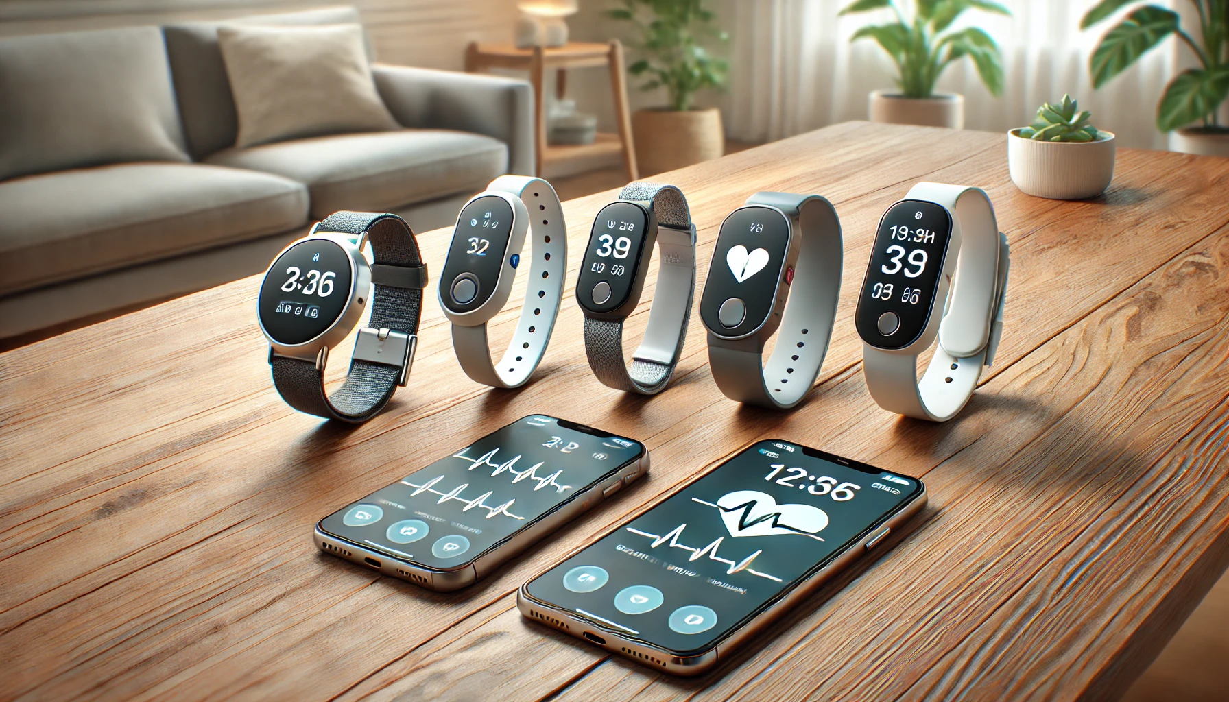 A collection of five portable ECG monitors for home use, including wrist-worn devices, handheld gadgets, and sleek tech designs, displayed on a wooden desk with a smartphone screen showing mobile app interfaces beside each device in a well-lit environment.